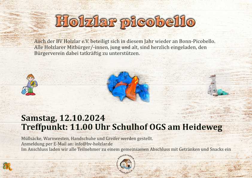 Auch der BV Holzlar e.V. beteiligt sich in diesem Jahr wieder an Bonn-Picobello. Alle Holzlarer Mitbürger/-innen, jung und alt, sind herzlich eingeladen, den Bürgerverein dabei tatkräftig zu unterstützen. Müllsäcke, Warnwesten, Handschuhe und Greifer werden gestellt.Treffpunkt: Samstag, 12.10.2024, 11.00 Uhr, Schulhof OGS Heideweg