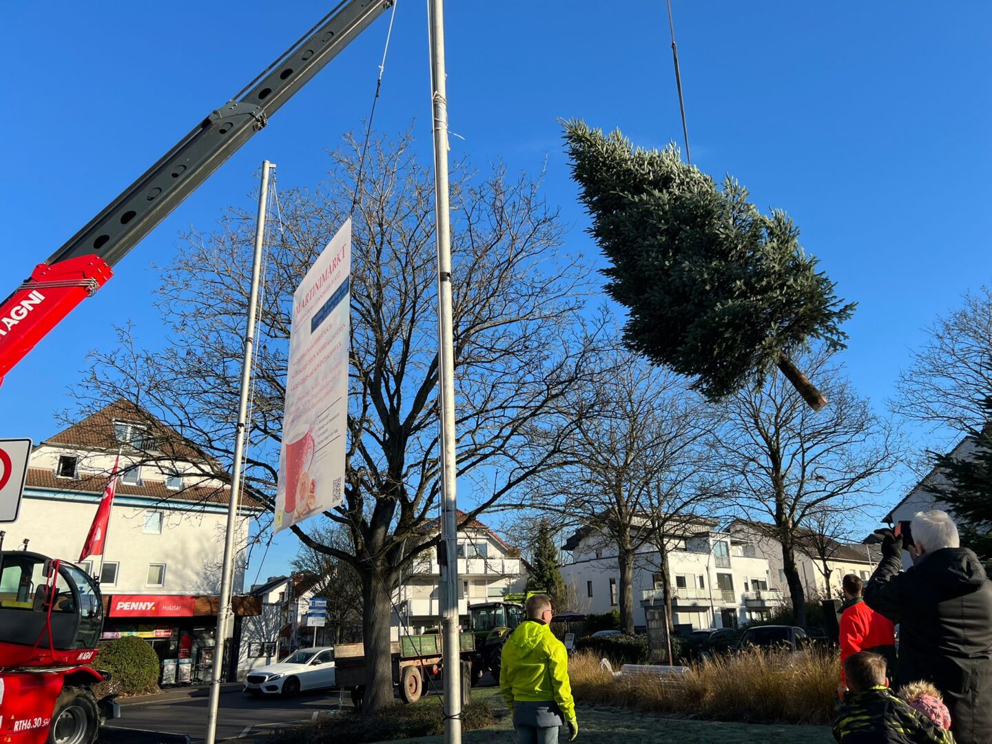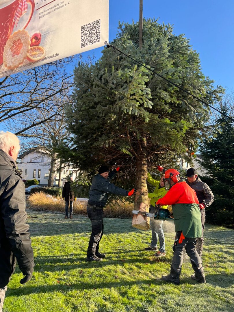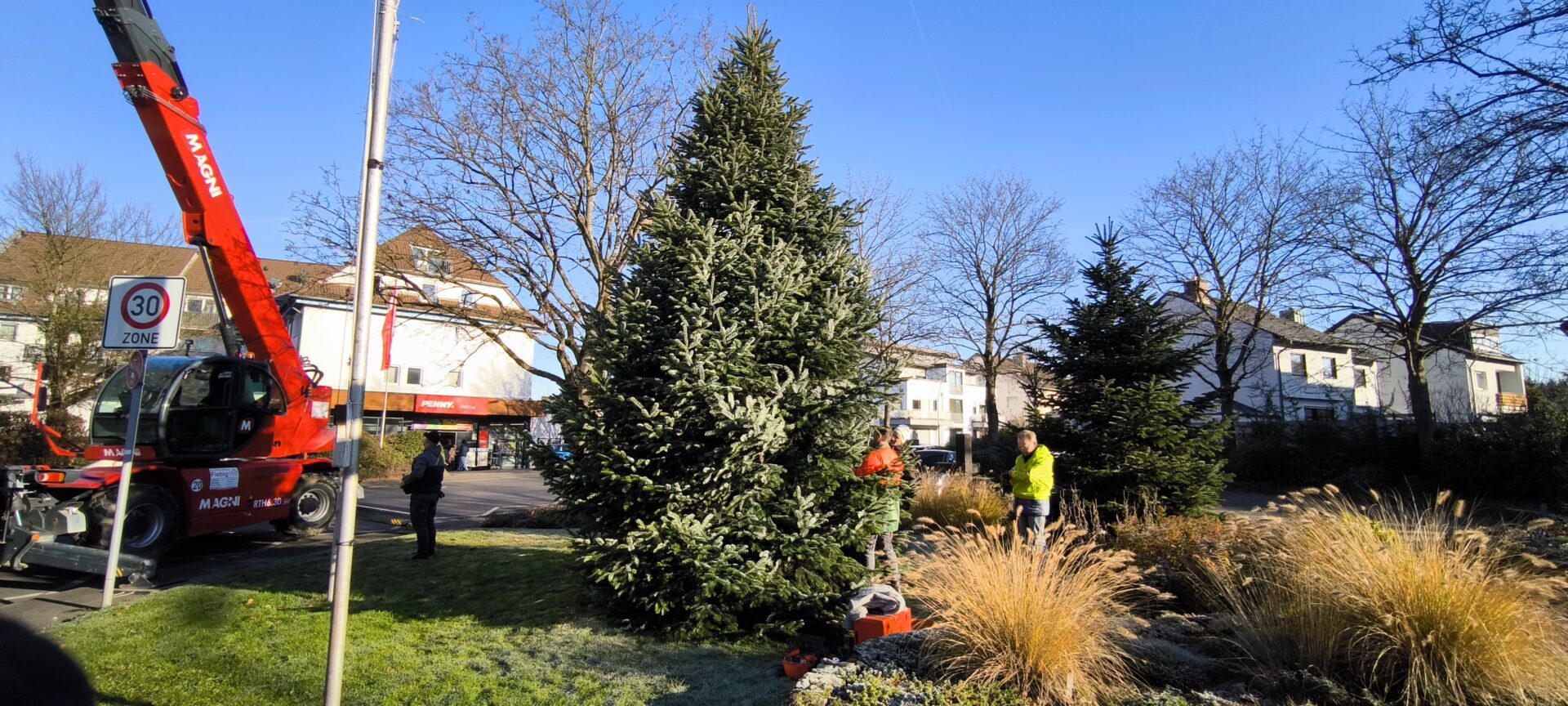 Am Samstag, den 21.11.2025 wurde der über neun Meter hohe wunderschöne Weihnachtsbaum von der Firma Wolter GbR geliefert. Beim Aufstellen am Siebenwegekreuzplatz unterstützte die Bauunternehmung Fiebig den Bürgerverein Holzlar tatkräftig, denn allein hätte der Verein das nicht stemmen können. Die Stadtwerke Bonn sorgten für die Beleuchtung, die Kinder der Kita „Ennertzwerge“ übernahmen die festliche Dekoration. Zum Abschluss wurde gemeinsam ein Weihnachtslied gesungen und es gab Plätzchen sowie heißen Kakao – ein rundum gelungenes Event!