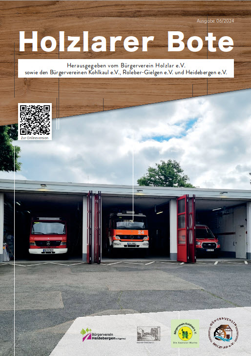 Die neue Ausgabe des Holzlarer Boten Ausgabe Juni 2024 ist unter Beteiligung der Bürgervereine Holzlar, Kohlkaul, Roleber-Gielgen und Heidebergen erschienen. Der Holzlarer Bote wird an die Mitglieder der Bürgervereine verteilt und liegt in einigen Holzlarer Geschäften zum Mitnehmen aus.