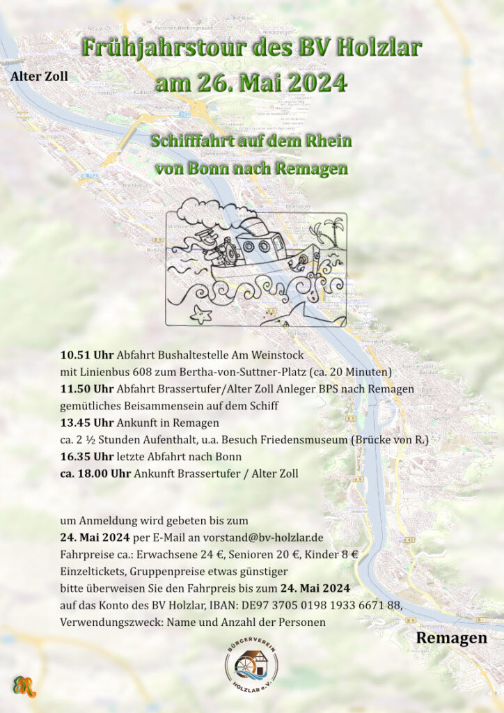 Der BV Holzlar e.V. lädt seine Mitglieder am Sonntag, den 26.05.2024, zu einer Schiffstour auf dem Rhein nach Remagen ein. Die Abfahrt mit einem Ausflugsschiff der Bonner Personenschifffahrt ist um 11.50 Uhr am Anleger der BPS Brassertrufer/Alter Zoll. Die Anfahrt mit dem Linienbus 608 erfolgt ab der Haltestelle am Weinstock in Holzlar um 10.51 Uhr. Die Fahrt zum Bertha-von Suttner-Platz dauert ca. 20 Minuten, der Fußweg zum Anleger Alter Zoll ca. 10-15 Minuten.