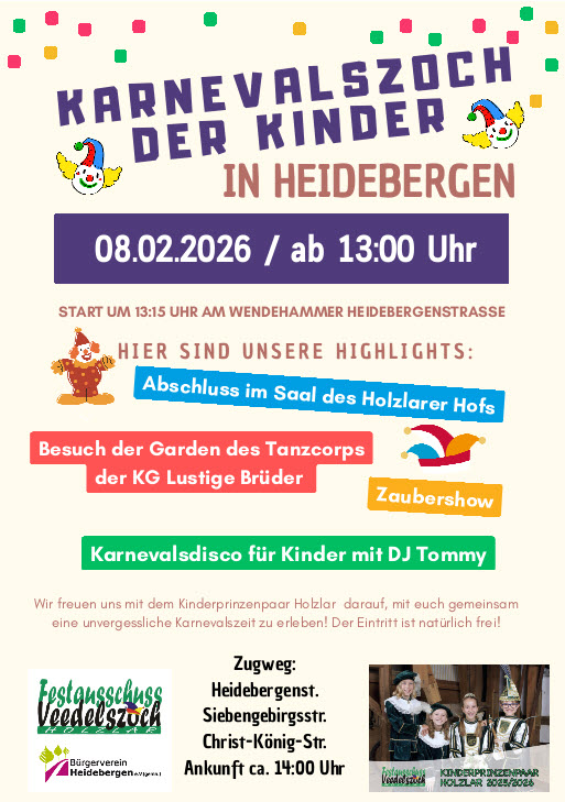 Am Sonntag, den 08. Februar 2026, findet der traditionelle Kinderkarnevalszug in Heidebergen statt. Die Besonderheit an diesem Zug ist, dass Kamelle von außen durch Anwohner und anderen Personen am Straßenrand in den Zug geworfen werden.