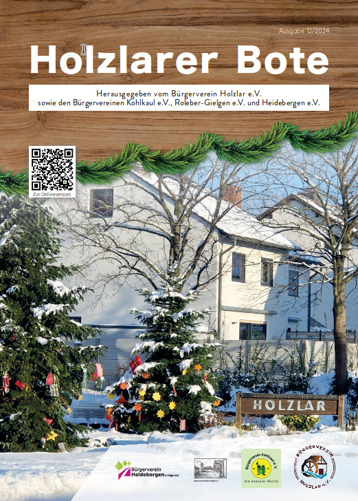 Die neue Ausgabe des Holzlarer Boten Ausgabe Dezember 2024 ist unter Beteiligung der Bürgervereine Holzlar, Kohlkaul, Roleber-Gielgen und Heidebergen erschienen. Der Holzlarer Bote wird an die Mitglieder der Bürgervereine verteilt und liegt in einigen Holzlarer Geschäften zum Mitnehmen aus.