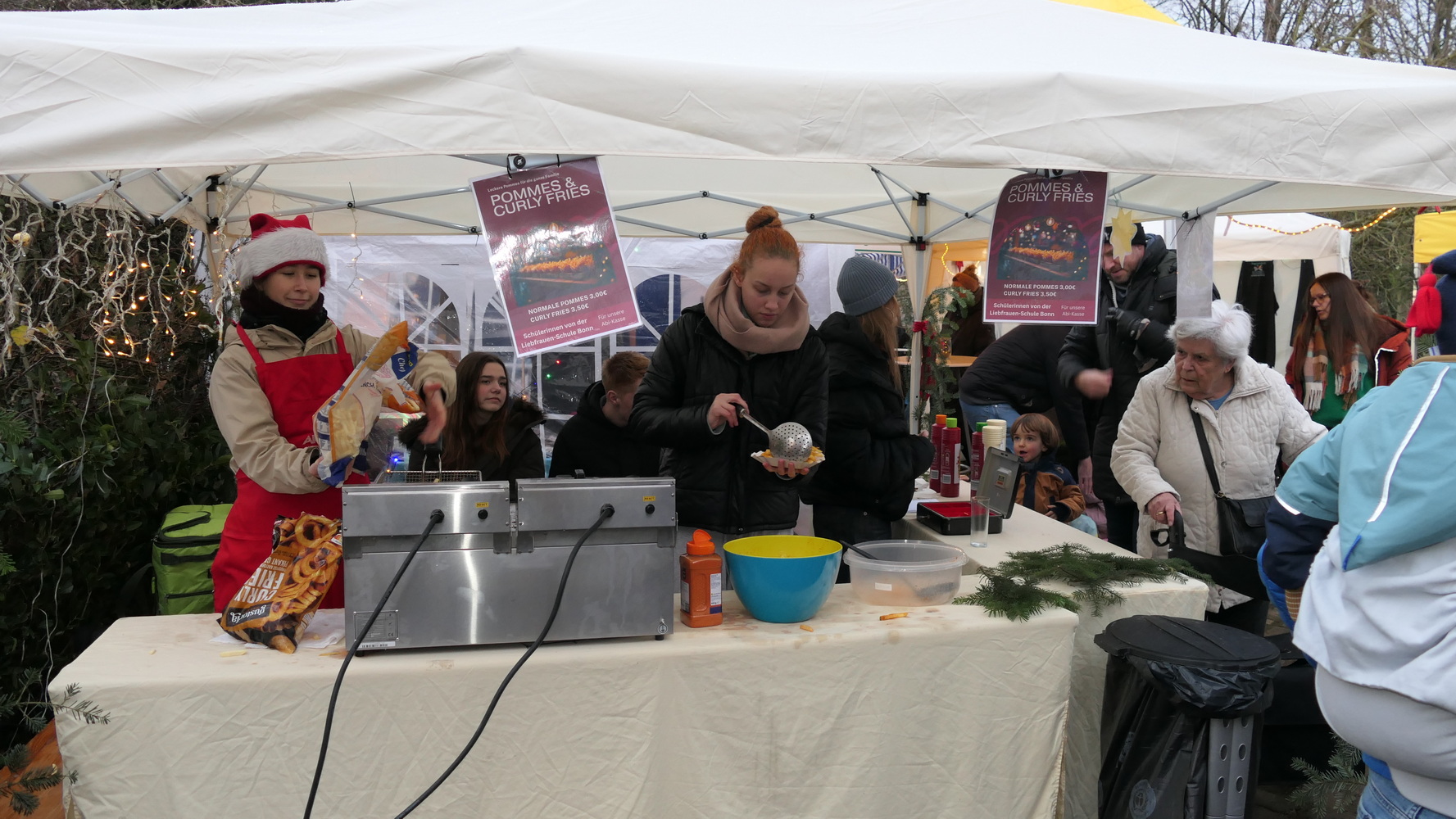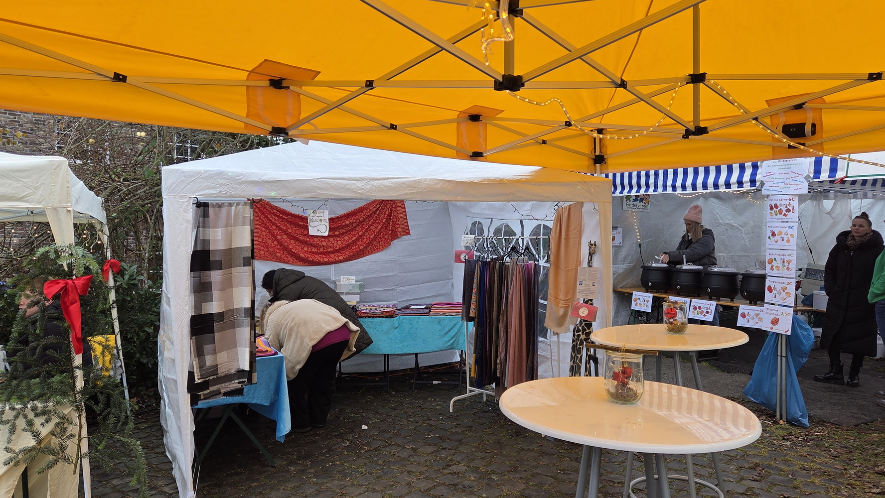 Für das leibliche Wohl sorgten erprobte kulinarische Angebote: Besonders gefragt war der Kesselskuchen (Puttes), frisch zubereitet in Holzlarer Küchen. Daneben wurden Bratwurst, Pommes, Suppen, Empanadas sowie Waffeln und Crêpes angeboten. Große Resonanz fanden außerdem Hot Aperol, Glühwein, Kinderpunsch und Eierpunsch; Bier und alkoholfreie Getränke standen ebenfalls zur Auswahl.
